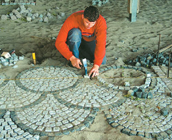 In Ergänzung zur überbetrieblichen Lehrlingsunterweisung im Straßenbauerhandwerk bietet die HwK Koblenz in ihrem Berufsbildungszentrum Bad Kreuznach den Auszubildenden im 2. Lehrjahr zwei jeweils einwöchige freiwillige Zusatzlehrgänge mit fachbezogenen Inhalten an. Mehrkosten entstehen den Betrieben dadurch nicht, da sie mit der Urlaubs- und Lohnausgleichskasse in Wiesbaden abgerechnet werden. 11 von 17 Lehrlingen nehmen dieses Zusatzangebot wahr - ein Zeichen für die gute Akzeptanz bei den Betrieben. Zu ihnen gehört Markus Junker, der im Unternehmen Thomas in Kirchberg lernt. Er erarbeitet sich das Anlegen und Pflastern von Schuppen im Mosaikpflaster, wofür zwei Tage veranschlagt werden.